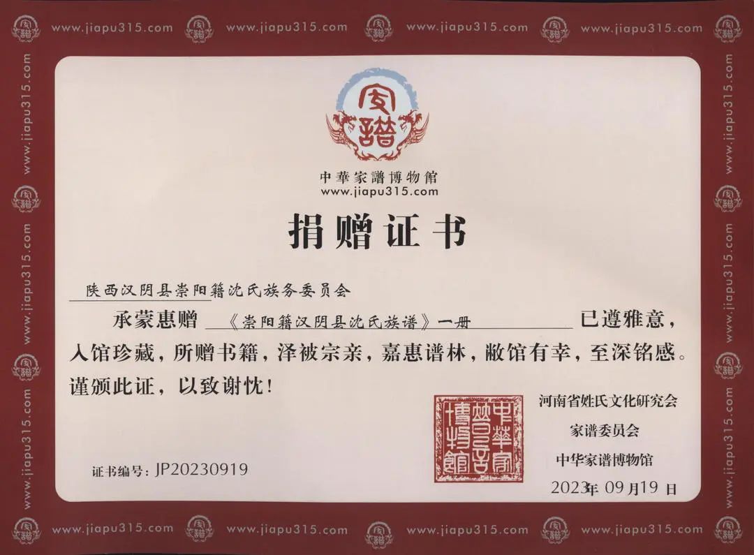 日前,陜西漢陰縣崇陽籍沈氏族務委員會向我館捐贈了一冊《崇陽籍漢陰縣沈氏族譜》。我館接受了饋贈,并回寄了收藏證書。