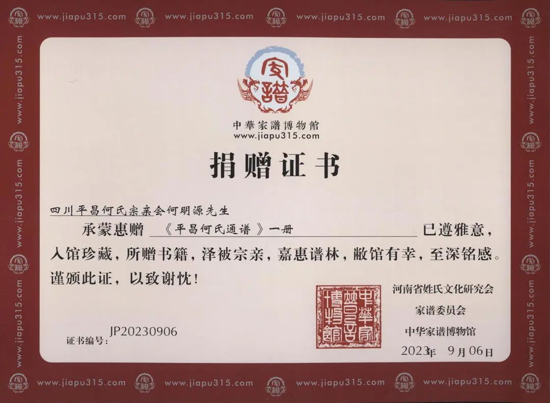 日前,四川省平昌縣何氏宗親會何明源先生向我館捐贈了一冊《平昌何氏通譜》。我館接受了饋贈,并回寄了收藏證書。