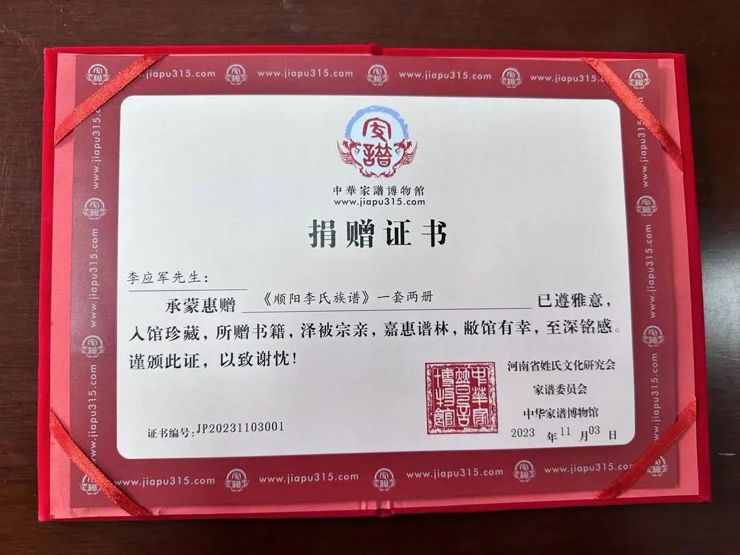 日前,河南省鄧州市順陽李氏家族在我館編印完成了《順陽李氏族譜》。出于對錦秋文譜中華家譜館業(yè)務(wù)能力的肯定,也為了方便李氏子孫后代續(xù)修家譜以及同姓宗親尋根,經(jīng)《順陽李氏族譜》編委會一致決定,以郵寄方式向我館捐贈《順陽李氏族譜》一套兩冊。我館接受了饋贈,并向捐贈者李應(yīng)軍老師回寄了收藏證書。