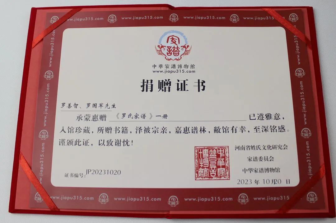 日前,河南省鄭州市羅善智、羅國軍先生與錦秋文譜中華家譜館的張編輯取得聯(lián)系,并親自向我館捐贈《羅氏家譜》一冊。張編輯接受了饋贈,并回贈了收藏證書。