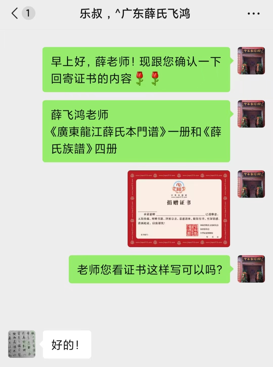 日前,薛飛鴻先生向錦秋文譜|中華家譜館捐贈(zèng)《廣東龍江薛氏本門譜》一冊和《薛氏族譜》四冊。我館張編輯接受了饋贈(zèng),并向老師回寄了收藏證書。