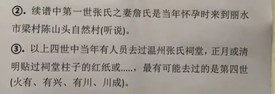 ③.以上四世中當(dāng)年有人員去過溫州張氏祠堂,正月或清明貼過祠堂柱子的紅紙或...,最有可能去過的是第四世(火有、有興、有川、川成)。