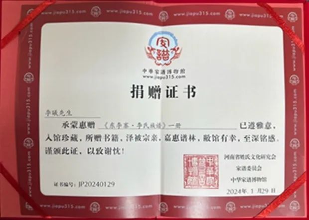 日前,河南新鄉(xiāng)李曦先生向我館捐贈了一冊《李氏族譜》。我館接受了饋贈,并回寄了收藏證書。