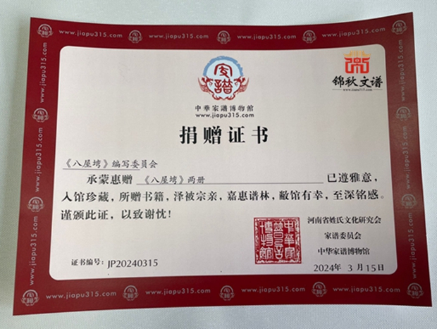 近日,錦秋文譜|中華家譜館收到了來自《八屋塆》編寫委員會的饋贈!我館在收到塆志的第一時(shí)間就給老師回寄了收藏證書以示感謝!