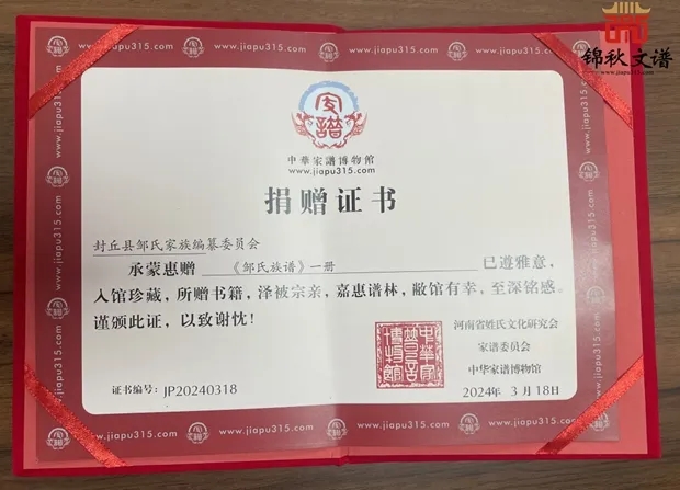 同時(shí),鄒氏家族還將本族珍貴的《鄒氏家譜》贈(zèng)予錦秋文譜一套,作為收藏和展覽之用。這份厚重的禮物,不僅是對(duì)錦秋文譜的信任與認(rèn)可,更是對(duì)家族文化的尊重與傳承。我館深感榮幸,也為能夠收藏這份珍貴的家譜而自豪。為表達(dá)感激之情,我館特回贈(zèng)收藏證書,愿與鄒氏家族共同守護(hù)這份家族的記憶與榮耀。