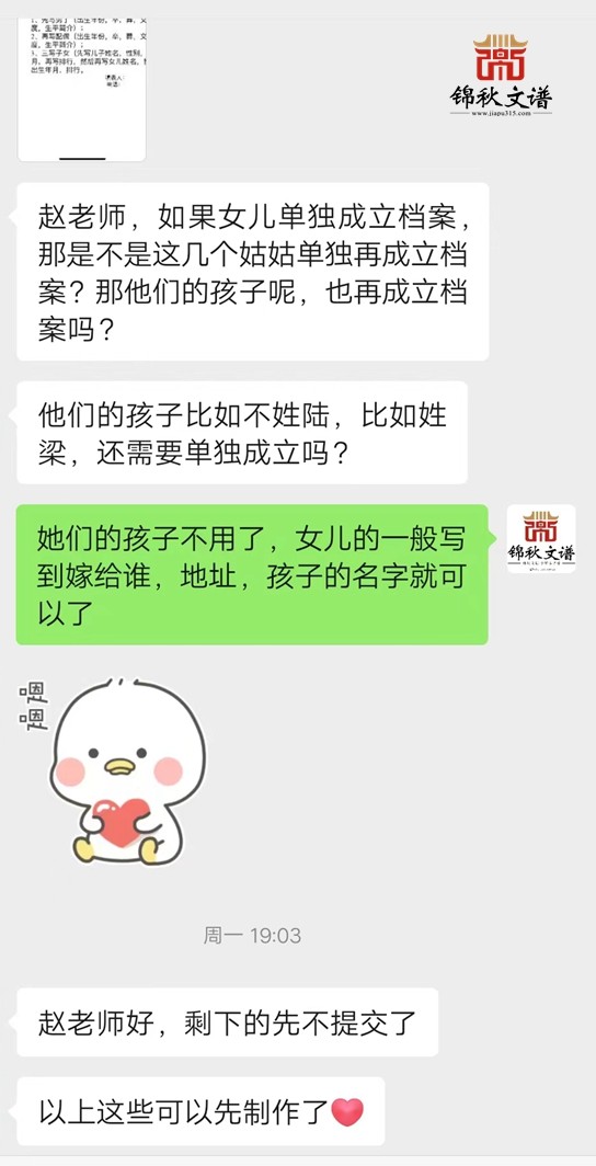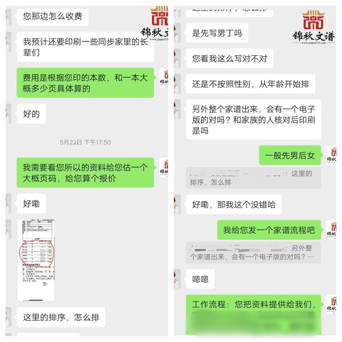 關(guān)于家譜中人物排序的疑惑,趙編輯耐心地指出,一般而言,先列男性再列女性。對于女兒及其子女的記錄方式,她給出了專業(yè)的建議:女兒部分通常記錄其嫁娶對象、居住地以及孩子的姓名即可。在逐一解答了陸老師的所有疑惑后,5月27日,陸老師欣然交付了家譜編印的首期款項(xiàng)。如今,這部承載著家族記憶的家譜已順利進(jìn)入初排階段,期待著它早日以完美的姿態(tài)呈現(xiàn)在世人面前。