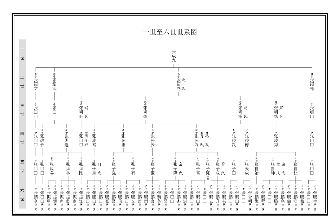 張□□:紹舜曾孫,名字生卒失考。生子二:名字均失考(據(jù)考證其生四子,老四外號“老四虛”因名字失考,未錄入世系)。