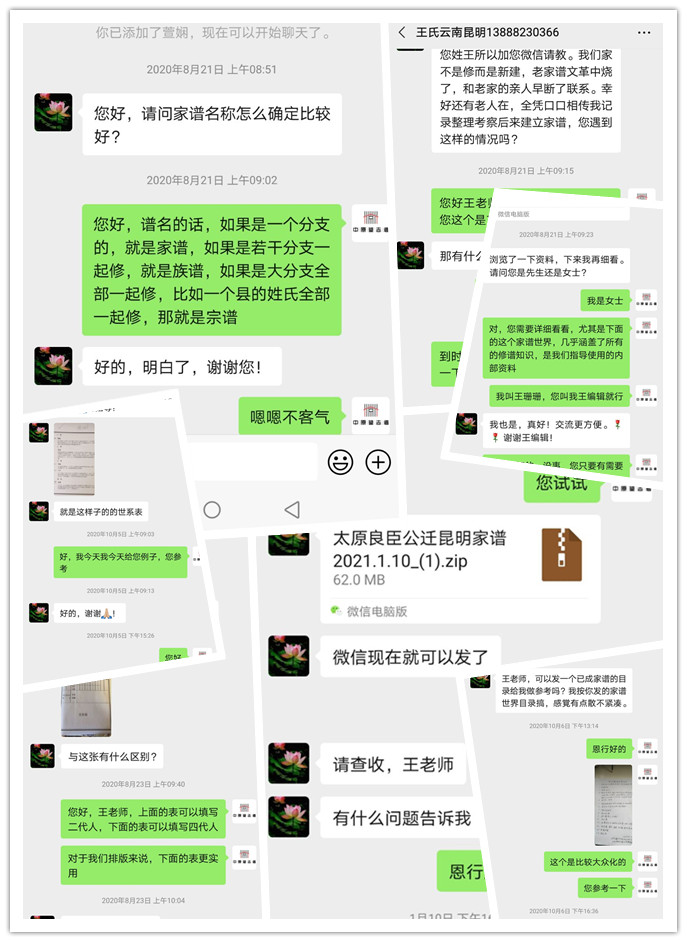 本譜主要是和云南昆明王氏宗親主編:王榮周和王惠萱共同完成,錦秋文譜主要是和惠萱于2020年8月21日開(kāi)始進(jìn)行溝通指導(dǎo),從譜名的確定,到指導(dǎo)資料的發(fā)送,后續(xù)入譜人員資料的確定。所有人的流程細(xì)節(jié)王老師都非常的謹(jǐn)慎,作為家族中的女兒,對(duì)資料內(nèi)容非常的慎重,歷經(jīng)4個(gè)月的資料整理搜集和確認(rèn),于2012年1月份最終定下來(lái),中間和王老師經(jīng)過(guò)了無(wú)數(shù)次的溝通和交流,對(duì)王老師認(rèn)真負(fù)責(zé)的態(tài)度也非常的感動(dòng),希望王氏宗親后代子孫身體健康,越來(lái)越好!以下是和客戶的微信溝通交流記錄: