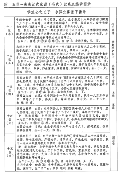 “五世一表表記式(馮式)",家譜世系表編修法,是筆者在學(xué)習(xí)前人家譜編修格式(歐式、蘇式、寶塔式和牒記式)和現(xiàn)代家譜編修格式(圖文對照式、橫排圖表式、豎排圖文式、表記式和圖記式)基礎(chǔ)上,繼承和借鑒前人的思想精華,而研制的編修方法。其體例格式屬于老家譜格式的演化,用現(xiàn)代文體編輯,屬于現(xiàn)代家譜編修格式的一種。其特點是: