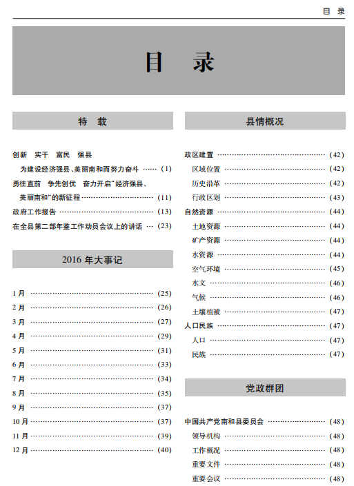 四、本年鑒設(shè)概況、城建環(huán)保、交通通信、政治、人民團(tuán)體、政法軍事、綜合管理、經(jīng)濟(jì)、商業(yè)貿(mào)易、財(cái)稅金融、科教文衛(wèi)、社會(huì)民生、鄉(xiāng)鎮(zhèn)概況13個(gè)類(lèi)目,類(lèi)目前設(shè)特載、大事記。