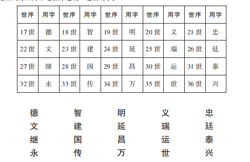 注:此意為望我族后代子孫品德高尚,聰明智慧,明事懂理,要做忠誠(chéng)仁義之士;博學(xué)多才,強(qiáng)體健身,生生不息,光耀門(mén)庭;