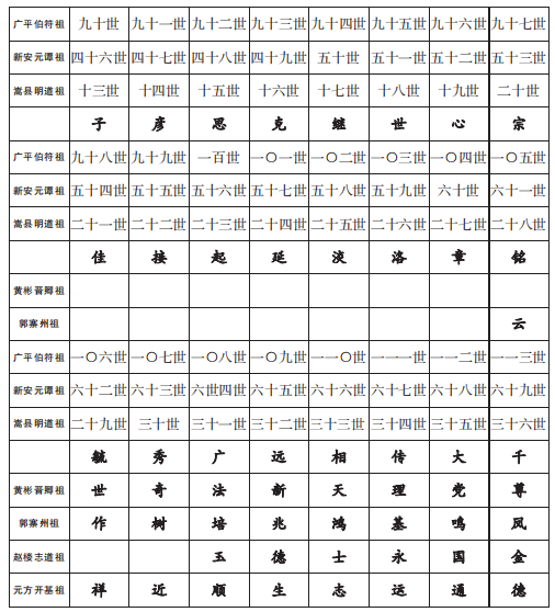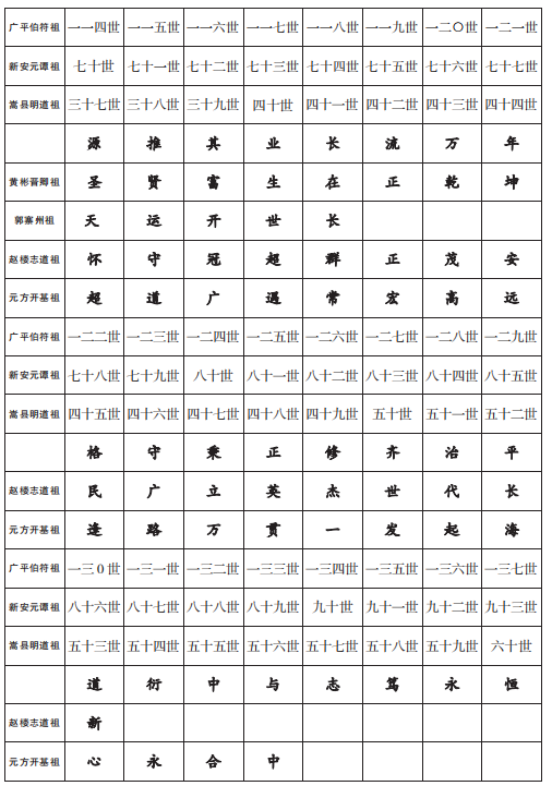 輩字譜在譜藤學(xué)上又稱【行第】。借以標(biāo)明其人所屬宗族和其在族內(nèi)世序先后高低,使之在千支百派紛紜復(fù)雜支裔中各人地位不至顛倒混亂。故各宗族內(nèi)部皆定有華字。然而,我系族大人繁,輩字尚未統(tǒng)一,給辦事、交流帶來(lái)諸多不便。鑒于一些實(shí)際原因,避免弊端,實(shí)有擴(kuò)大輩字范圍之必要。經(jīng)商定,將原從明道祖十三世起,采用的“四十八”個(gè)統(tǒng)一輩字書(shū)于其下,望各脈在添丁起名時(shí),盡量遵照?qǐng)?zhí)行,但不強(qiáng)求。另因【源推其業(yè)】中的【推】字不便起名,故將【推】字?jǐn)M【孟】字,與【推】并用。望族人起名時(shí)自行選擇。同時(shí)將廣平伯符祖、新安元譚祖、嵩縣明道祖、黃彬晉卿祖、郭賽州租和趙樓志道祖、遠(yuǎn)方開(kāi)基租支系輩字譜書(shū)于其下,以仿對(duì)照。