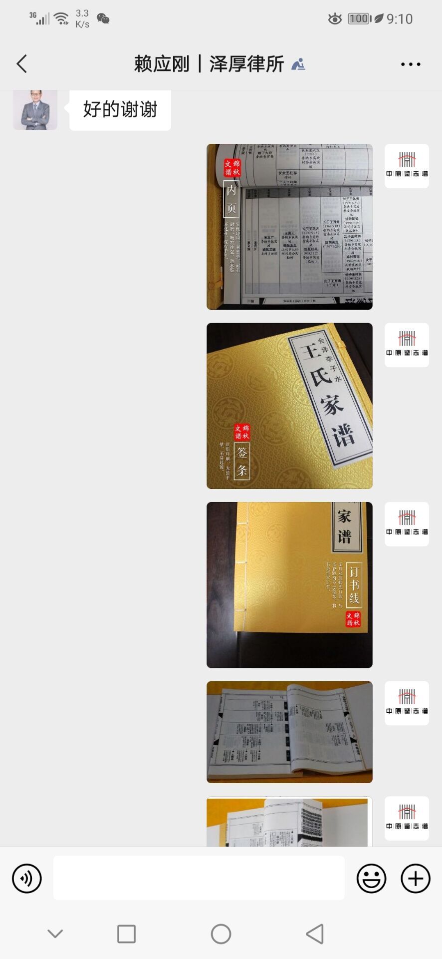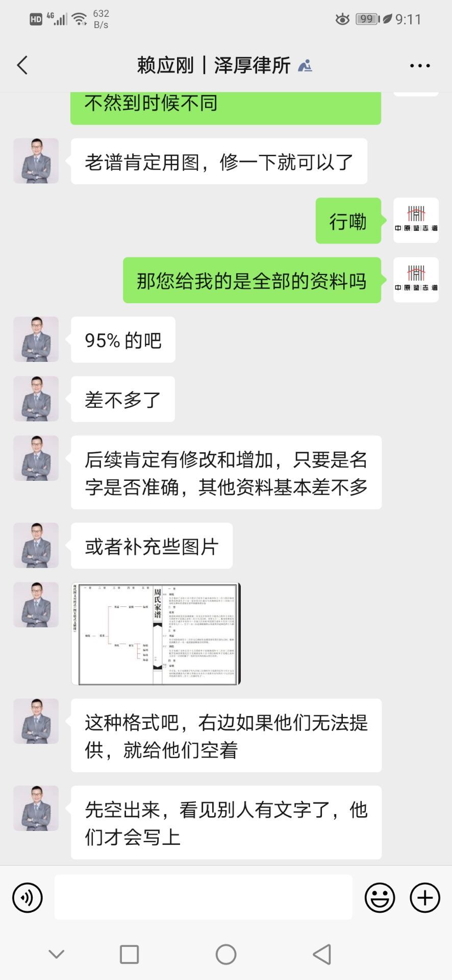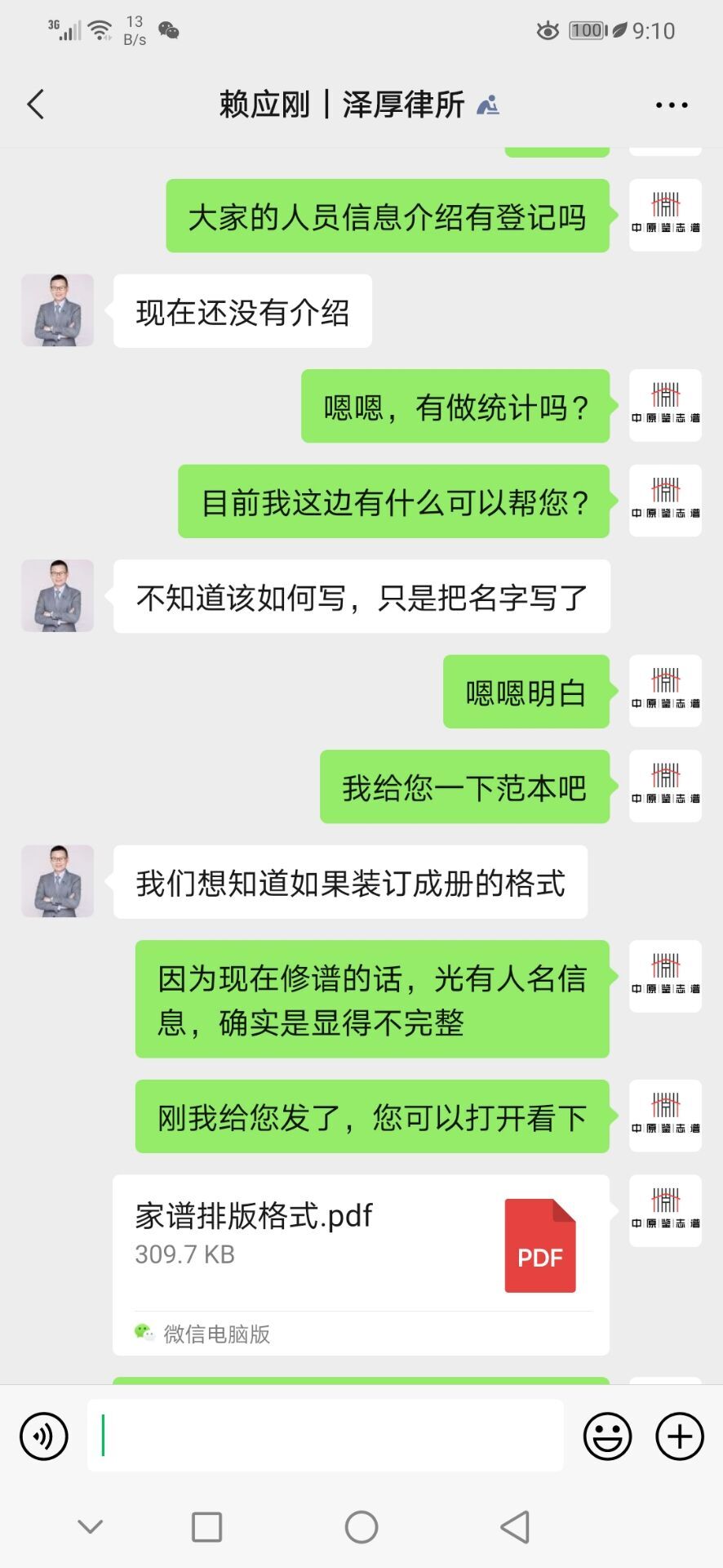 針對賴老師的疑問,家譜印刷制作公司王編輯一一做出了解答,并發(fā)送過去了家譜排版格式范本。并建議到,可以先把賴老師自己的信息搜集后,以模板的形式告知宗親,有電子版的文件,很便于填寫。另外各個小分支可以專門安排一個搜集表格的人員,要不然獨立完成這么多的信息搜集會比較困難。等搜集好一個小分支的,可以讓家譜印刷制作單位錦秋文譜設(shè)計人員幫做個樣板頁,這樣也好展示給宗親查看。