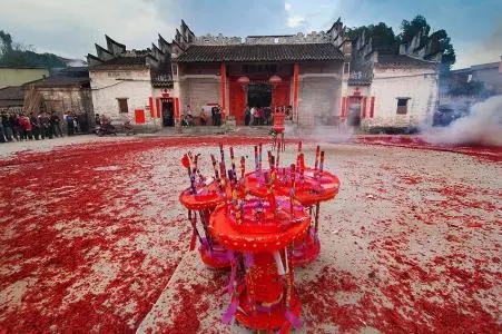 上燈儀式,一般在元宵前后舉行,不同的家族祠堂掛燈時間也不一致,一般都是先按照先大房再小房的順序進行并按照家族上年度上燈儀式后所生男孩數(shù),在祠堂廳堂梁上吊掛相同數(shù)量的花燈。掛燈儀式有掛燈、飲燈酒、在祠堂前燃放煙花炮竹等步驟。