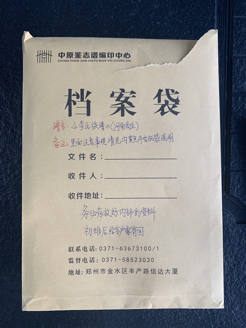 家譜排版設(shè)計是需要與客戶反復(fù)校對與修正的過程。只有秉承認真負責(zé)的態(tài)度,才能將家譜零失誤的呈現(xiàn)在族人面前。商丘李氏家譜目前已經(jīng)進行了兩次往返校對修改。每次客戶都非常認真的給出了修改意見,通過郵寄給錦秋文譜的檔案袋封面就可以看出來了。
