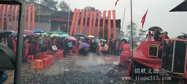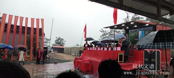 由于天氣下雨原因,恭祭始祖暨請譜儀式簡樸隆重,儀式分七項(xiàng)進(jìn)行:(一)全體肅立;(二)鳴炮;(三)主持人講話;(四)村書記恭讀祭文。(五)家譜編委會主編成益、信志作為代表分別進(jìn)行講話,介紹修譜情況;(六)副主編成剛宣讀捐款助譜功德榜和請譜范圍。(七)按人口請譜。