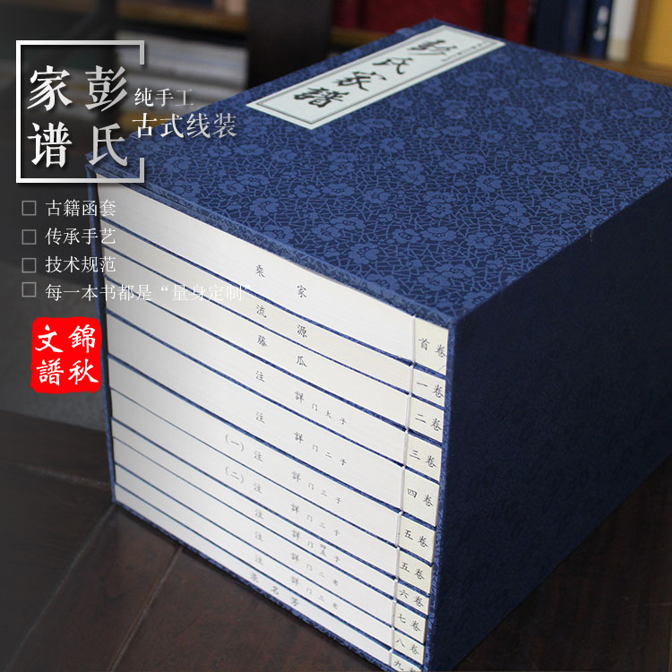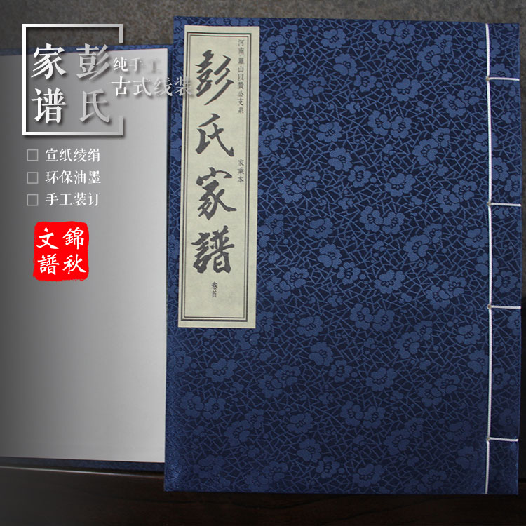 庚子年在老譜基礎(chǔ)之上再行續(xù)譜之事,由河南鄭州中原鑒志譜編印中心負(fù)責(zé)印刷制作,彭氏家譜一函十一冊,采用右裝訂,60g宣紙印刷,成品尺寸210*285。