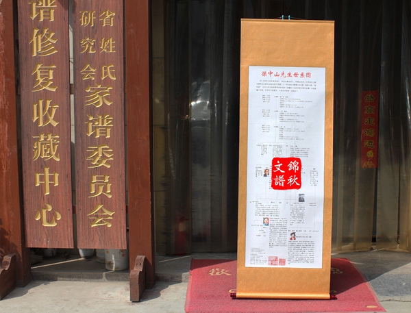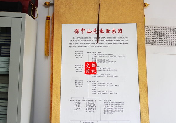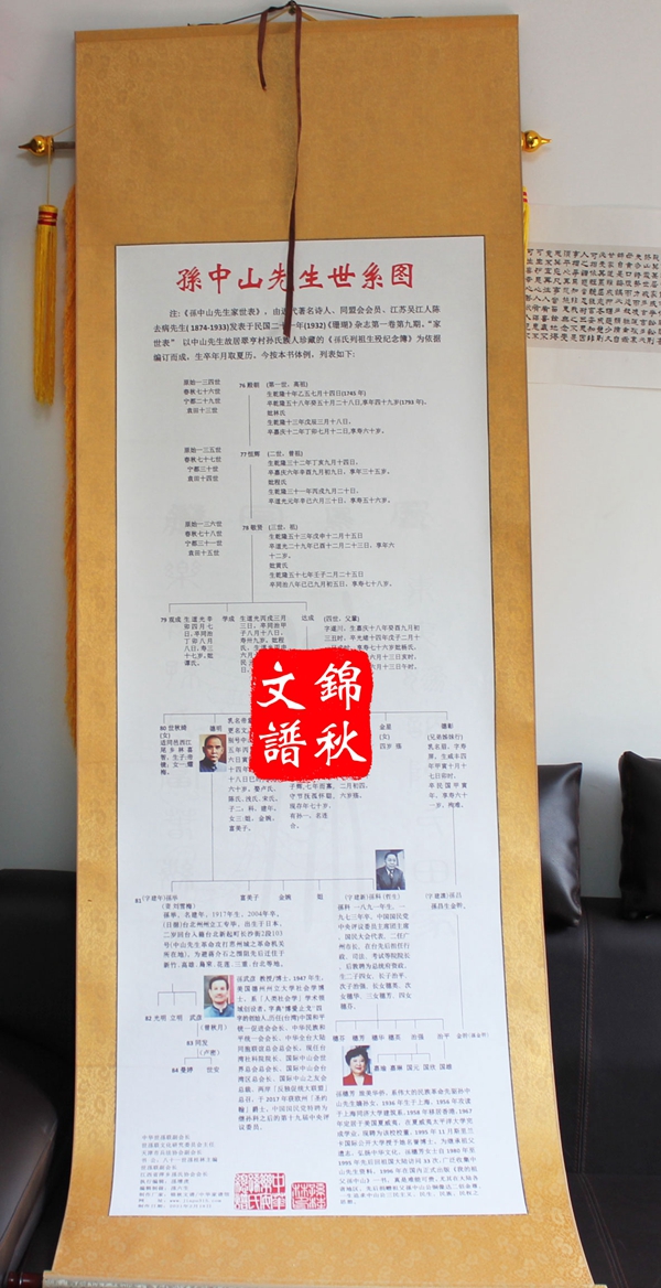 《孫中山先生世系圖》掛軸采用韓錦全綾精裱豎幅制作手法,由錦秋文譜家譜印刷制作廠家完成。