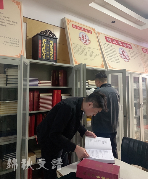 錦秋文譜焦編輯熱情接待了他,并陪同他一起在中華家譜館大量的書籍中查找相關(guān)信息。