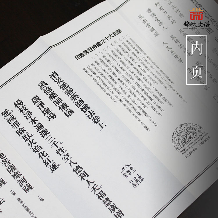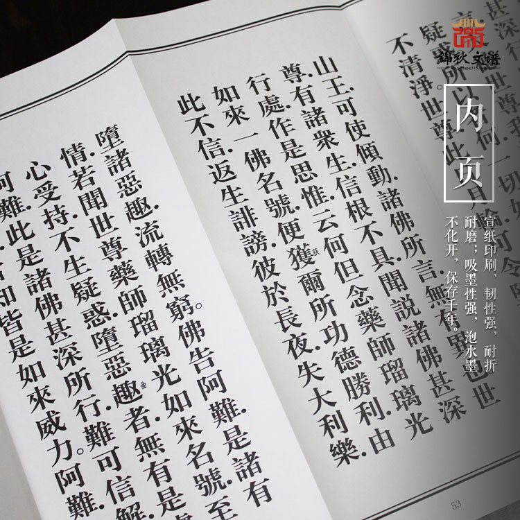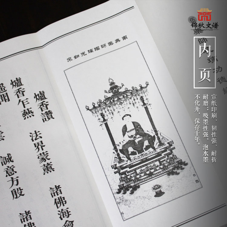 古籍影印并不是一件簡(jiǎn)單的事情,其需要使用特殊的紙張——宣紙。宣紙具有千年不化、防腐、防蟲(chóng)的功效,具體可看錦秋文譜之前的介紹。目前全國(guó)有宣紙印刷技術(shù)的也沒(méi)有幾家。今天小編來(lái)分享一下佛經(jīng)《藥師琉璃功德經(jīng) 藥師懺》的影印效果。