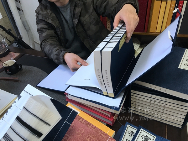 在溝通中了解到,王老師最近在編輯三槐堂禹州王氏家譜,過來學(xué)習(xí)學(xué)習(xí)。焦編輯拿出了線裝、精裝不同家譜制作種類的樣書給王老師做參考。在看樣書過程中,王老師提出了自己的疑問:“書號有什么作用?”