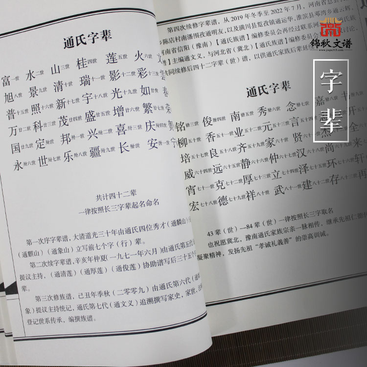 參天大樹必有其根,萬里江河必有其源。普天之下,炎黃子孫,一脈相傳。說世系、道宗族、辨親疏,以延宗親之道。國有史、縣有誌、族有譜,同為一理,此為通氏家族修譜之初衷。日前,《通氏族譜》的編印工作已經(jīng)完成,采用宣紙印刷,一函兩冊,彌足珍貴!
