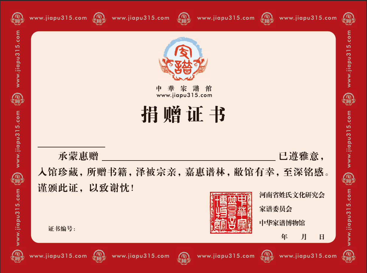 錦秋文譜中華家譜館也在此呼吁各位宗親積極捐贈譜書,不僅利于家譜長久保存、方便子孫后代續(xù)修家譜,更能幫助其他同姓宗親尋根溯源,功在當代,利在千秋!