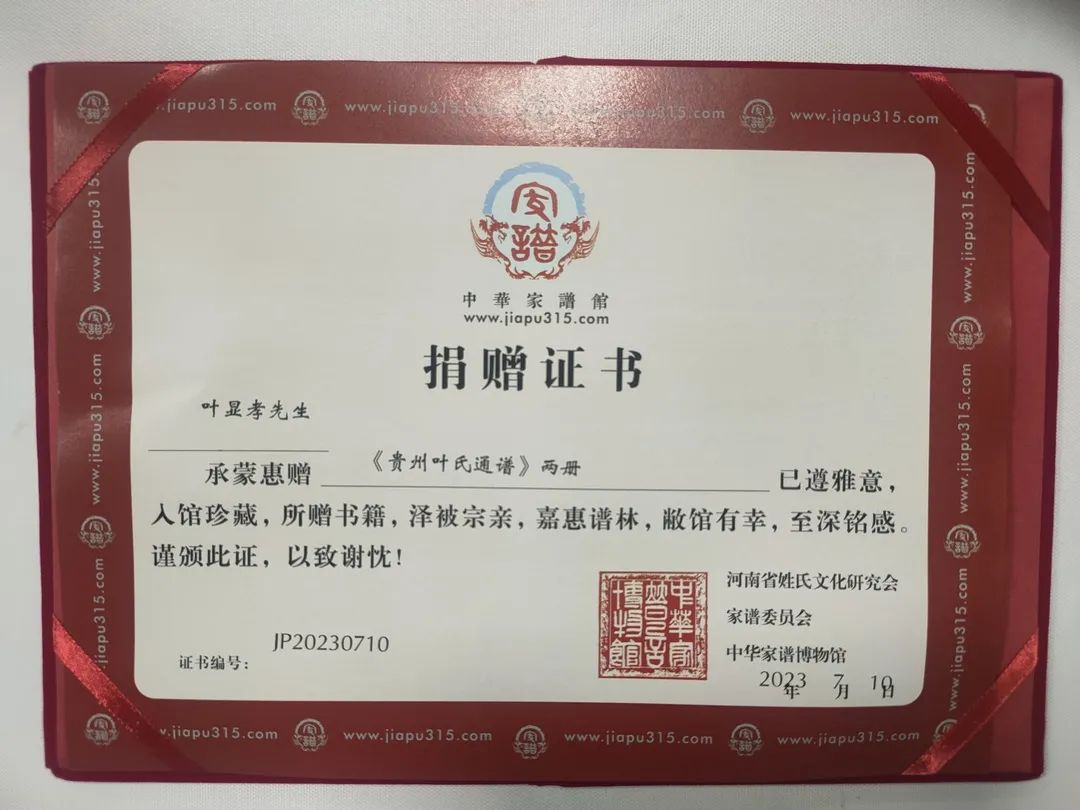 日前,貴州習水縣的葉顯孝老師向我館捐贈了上下兩冊《貴州葉氏通譜》。我館在收到通譜后,向葉老師回寄了收藏證書。