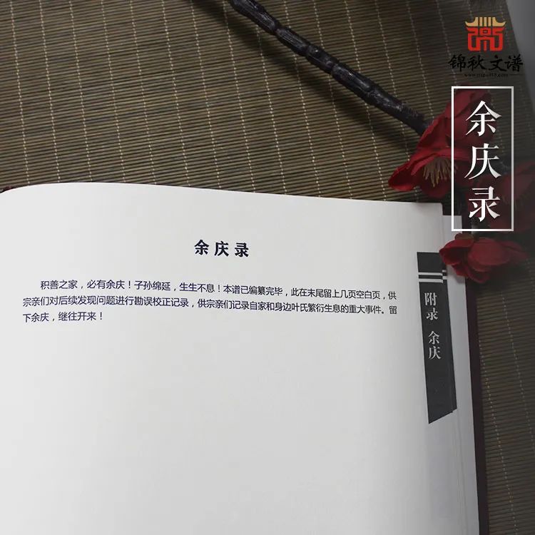 余慶錄在每年家族出現(xiàn)新生命時(shí)會(huì)作為記載家族添丁進(jìn)口的載體。余慶錄具有美好的寓意,就是昭示我們的子孫后代能夠瓜瓞綿綿、繁榮昌盛。所以在編修家譜時(shí)一定要給家譜留幾頁余慶錄。家譜最后幾頁所留的空白紙,供族中添丁進(jìn)口時(shí)填寫,所填寫的內(nèi)容包括家族人口變化情況和婚喪嫁娶、遷移、繼嗣等事項(xiàng),便于在下一次續(xù)修家譜的時(shí)候,將這些內(nèi)容補(bǔ)入到正式家譜中。