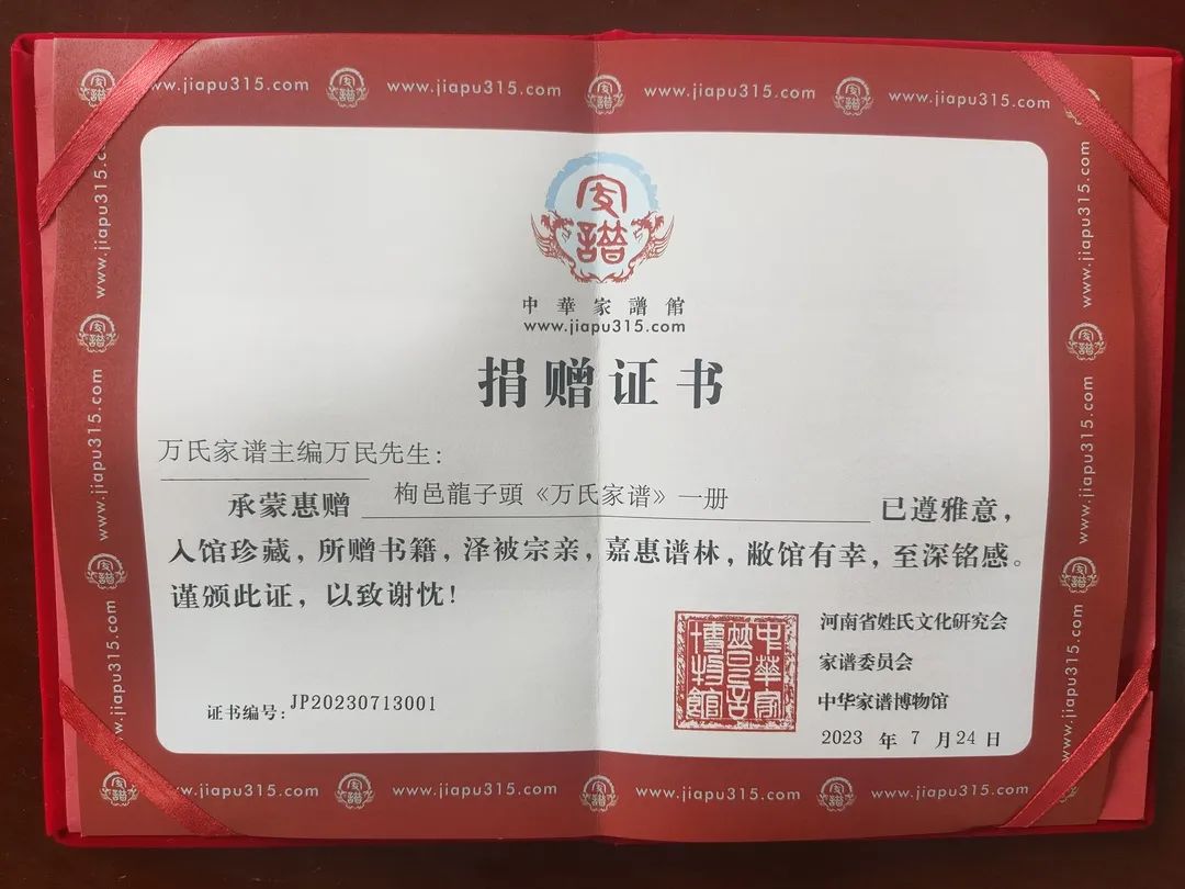 《旬邑龍子頭萬(wàn)氏家譜》的主編萬(wàn)民先生在網(wǎng)上看到錦秋文譜中華家譜館的號(hào)召各位宗親捐譜的文章,出于對(duì)我館的信任,萬(wàn)民先生將一冊(cè)家譜捐贈(zèng)至我館收藏,以便萬(wàn)氏族親尋根連脈!