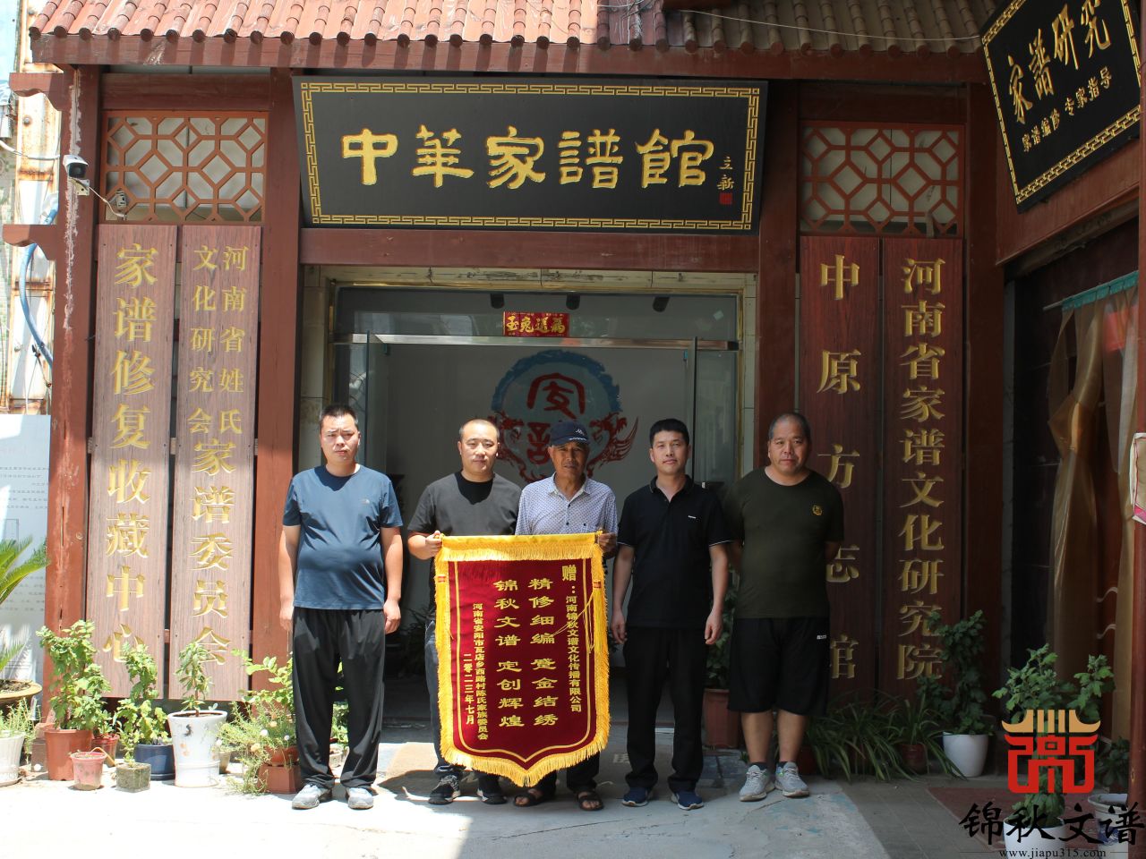 近日,得知掛軸已經(jīng)制作完成,于是陳氏家譜編委會一行五人懷著激動的心情來到了我中華家譜館請回家譜掛軸,并敬送了錦旗(精修細(xì)編 蹙金結(jié)繡 錦秋文譜 定創(chuàng)輝煌)。