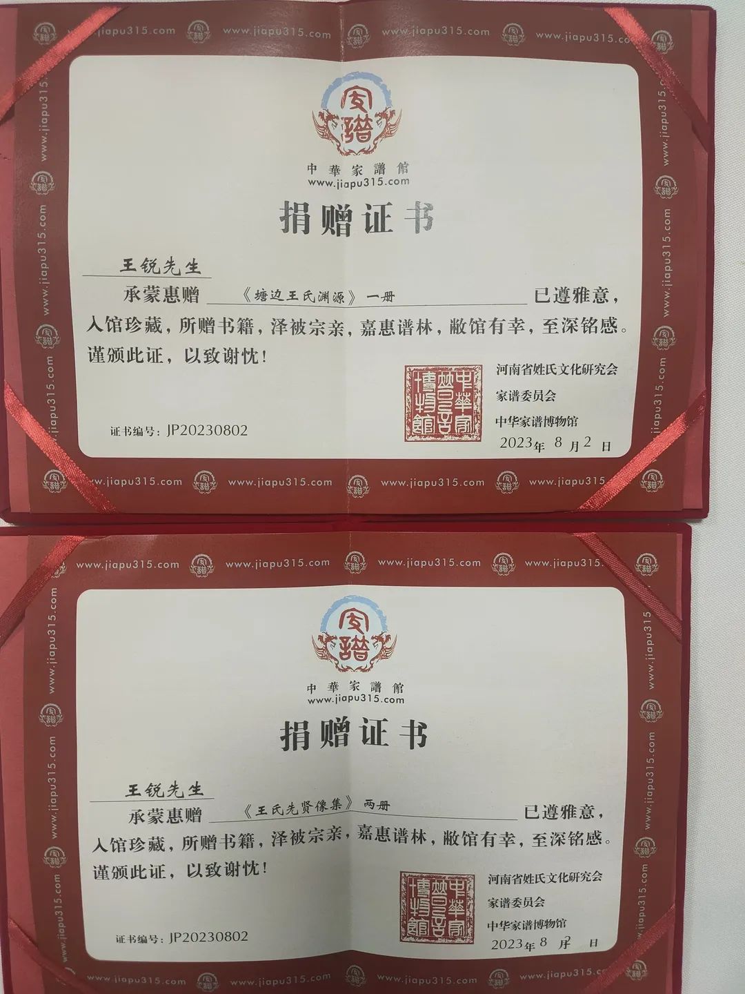 近日,廣東省揭陽市的王銳先生與我館焦編輯取得聯(lián)系,并將兩冊(cè)《王氏先賢像集》和一冊(cè)《塘邊王氏淵源》捐贈(zèng)至中華家譜館收藏。焦編輯接受了饋贈(zèng),并向王銳先生回寄了收藏證書。