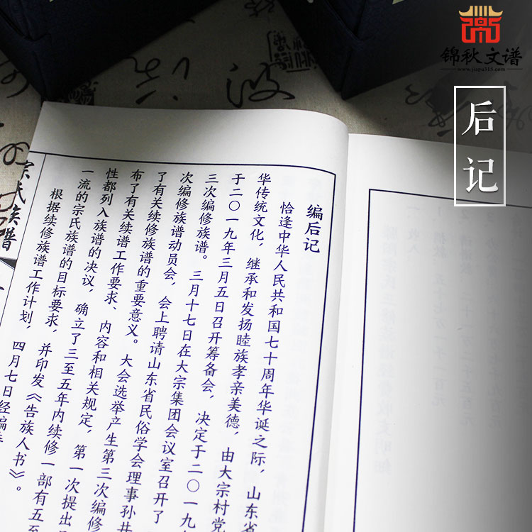 18、后記,是全譜籍的終章,它是一篇總結(jié)性的文章,更是對(duì)后人的誠摯告誡。內(nèi)容大致有:修譜乃本族祖先所制,后續(xù)是承先啟后的急務(wù);本屆所修的起始過程;修譜期間發(fā)生的重要事情簡介;為本修作出貢獻(xiàn)者的表彰;告之后人保持代代續(xù)修的訓(xùn)言教導(dǎo)等。