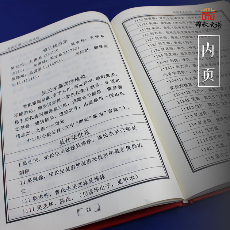 本譜,是對癸酉(19931年6月初4吳光群主持修定的歐家營《吳氏族譜》的補(bǔ)充?!墩繁鞠喈?dāng)于上冊、記至吳仕榮、吳仕孝、吳仕英;本譜相當(dāng)于下冊,記載吳仕榮后高落業(yè)于基江的三大支系(吳冠祿后裔吳誠系,吳芝瑕系,吳朝祿后裔吳訓(xùn)系)和類山市天評鄉(xiāng)堯龍山吳冠祿后裔吳芝釗支系。共四大支系。本譜是對壬成年(1982)吳元碧主持修定的甲子頭《吳氏族譜》的呼應(yīng)和校正。本譜和《甲》本是兩個分冊,《甲》本記載吳仕榮后裔在鐵燈山、柑子灣、桃子溝、向陽坪及李思壩的幾個支系和吳仕孝祖的全部后裔。吳仕孝祖后裔主要分布在甲子頭和吳家寨。本譜是對1982年吳澤斌主持修定的羊石坎《吳氏族譜》的擴(kuò)展?!堆颉繁居涊d吳冠祿后裔吳誠支系。吳澤斌既是《羊》本的修定者又是本譜的主持者。吳芝劍系(堯龍山)也建有譜,但敘文部分是錯的。