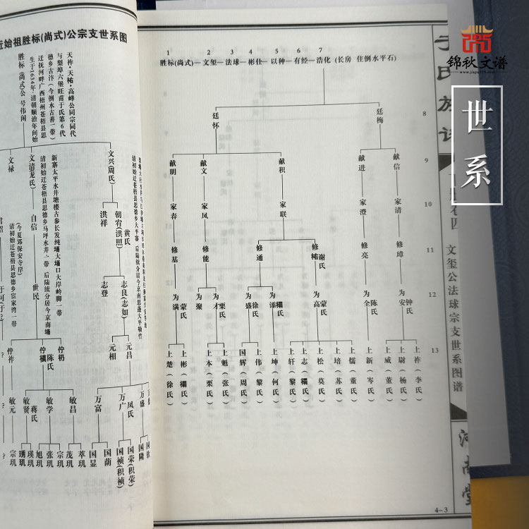 六、查閱時先弄清自己歸屬哪個宗支后裔,再找該宗支世系圖譜分卷詳細目錄;或按自己籍貫找到所屬宗支分卷,然后從該分卷詳目頁碼靠左的名字中找到自己或父親或祖父的名字,翻到名字最靠右的橫杠后數(shù)字頁碼,即能查到自己上下三代內(nèi)的直系或旁系的親人名字;再翻看名字次靠右的數(shù)字頁碼,可看到更上幾代直系和旁系先輩名字;又再翻看更次右數(shù)字頁碼查看更遠幾輩先祖之名,直至翻看橫杠右邊首個數(shù)字頁碼,可一直查看到始祖之名,這樣從上而下連起來便是自己的完整世系宗支圖。