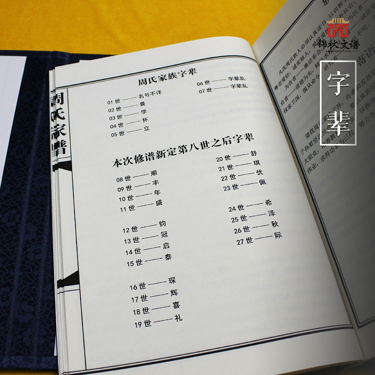 字輩是代表家族發(fā)展世代順序名稱(chēng)的重要標(biāo)志,從字輩可以看出哪些人是第幾代,哪些人和哪些人是同代,哪些人與哪些人相隔幾代。本著后人字輩不能和前人之輩相同,包括讀音也不能相同的這一基本原則,依據(jù)上述這一原則,分析我周氏家族子孫輩份排序、名號(hào)現(xiàn)狀來(lái)看,前四代還算有字輩可循(景、學(xué)、懷、立)。自立字輩之后子孫們就無(wú)字輩可循了,后輩之人目前已達(dá)上百人之多。無(wú)統(tǒng)一字輩名號(hào),起名號(hào)時(shí)混亂不堪,各行其事,再加之前輩以及我立字輩們當(dāng)中多年來(lái)一直沒(méi)有推舉出周氏家族中德高望重的族人來(lái)管理家族事務(wù),從而導(dǎo)致了上述我周氏家族后輩之人無(wú)字輩可循,名號(hào)混亂不堪這一突出問(wèn)題,這也是我周氏立字輩這代人要急需解決的大問(wèn)題,也是急需新修本次周氏家譜的原因之二。