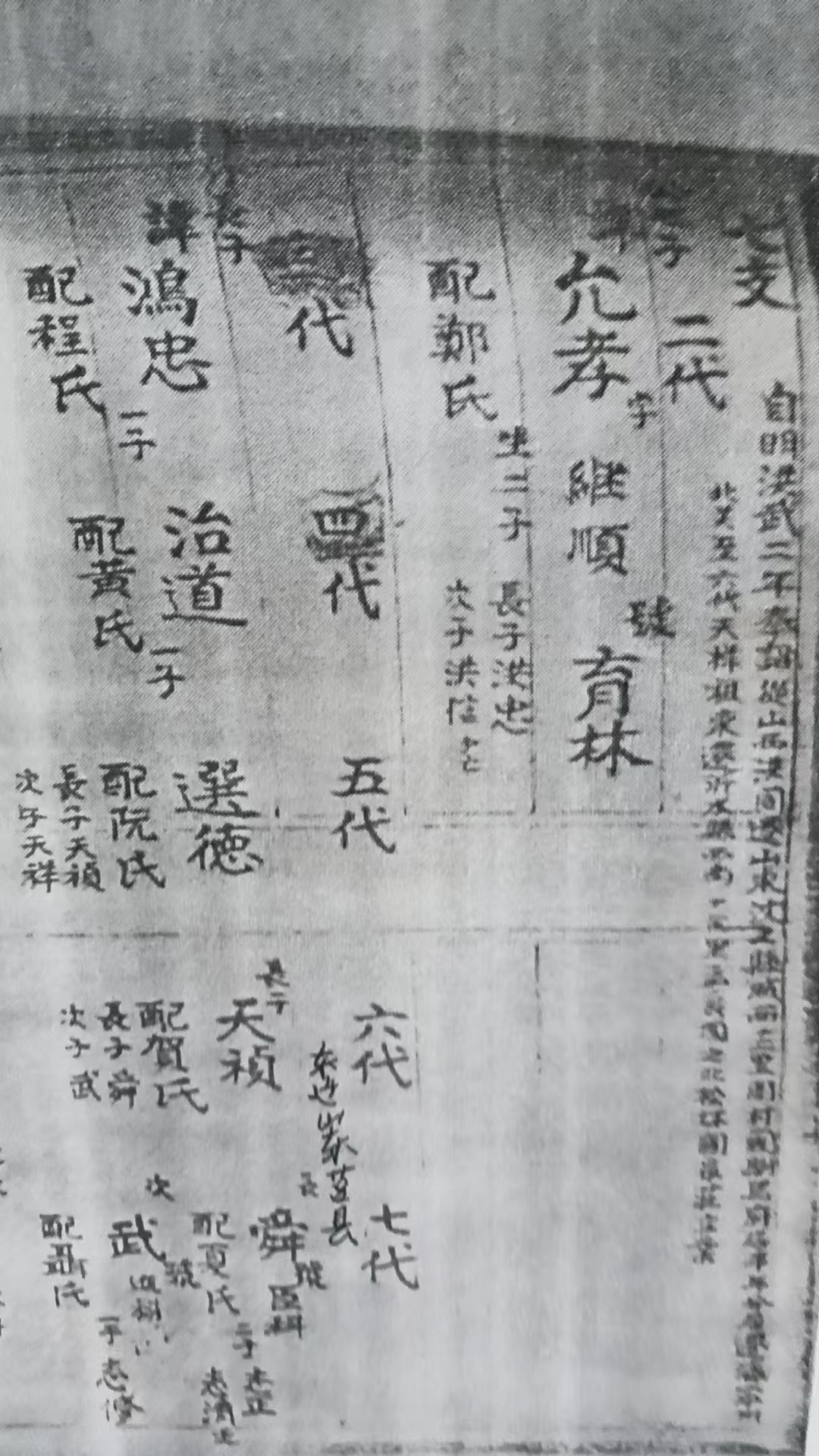 支源派生,記錄其跡:七支為俊亭公七子允孝,字繼順,號育林。自明洪武二年奉治從山西洪洞(返)遷山東汶上縣城西十二里周村國駙馬府,居半年分居遷濟寧州北關(guān),至六代天祥祖遷沂水西南孟良堌之北松林國家莊立業(yè)