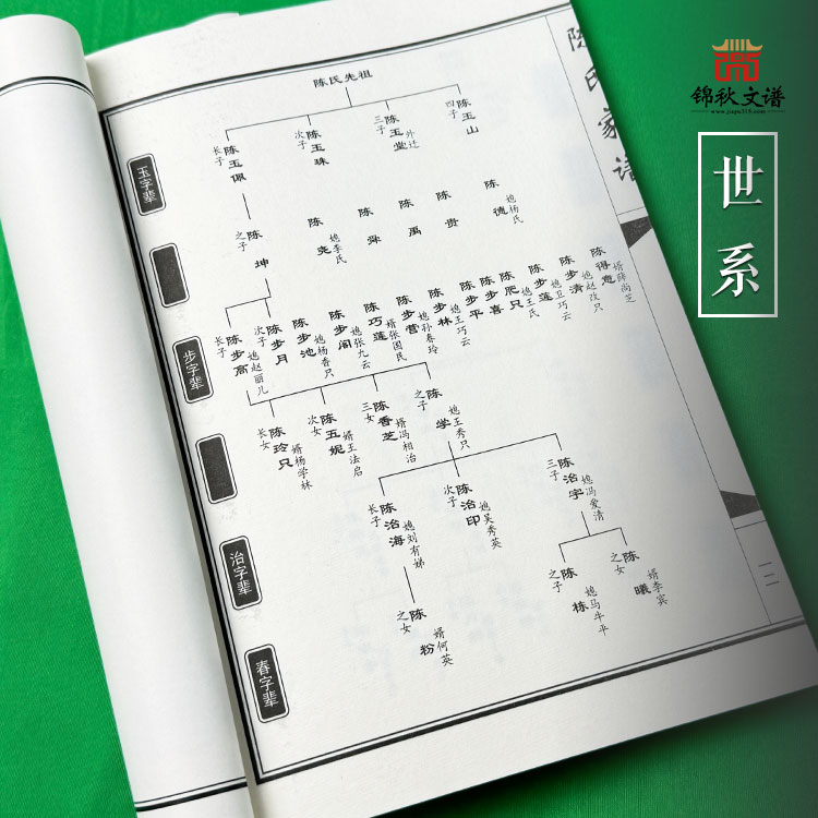本支脈家譜分三部分。第一部分,陳氏家譜族志有族人書寫和記載。第二部分:家譜掛軸。第三部分:巜陳氏家譜》書籍由河南省錦秋文譜文化傳播有限公司(中華家譜館)承接制作。一:家譜掛軸一幅,規(guī)格:320cmx220cm。用料:絲絹布。二:《陳氏家譜》書籍。40筒子頁(80頁)四筒子頁(11頁)。藍(lán)色梅花綾絹布,古式線裝。黑白用紙60克厚宣紙,彩色用紙80克古譜紙。裝訂形式,左裝訂。