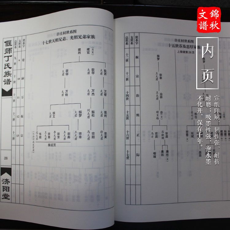 近日與錦秋文譜合作的河南洛陽(yáng)濟(jì)陽(yáng)堂丁氏族譜已全部編印完成,下面是一組丁氏族譜細(xì)節(jié)展示圖。