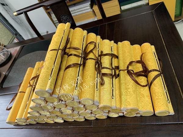 《孫中山先生世系圖》掛軸采用韓錦全綾精裱豎幅制作手法,由錦秋文譜家譜印刷制作廠家完成。