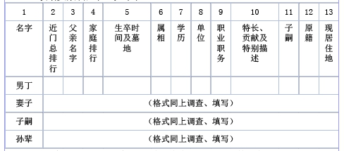 上表對龐氏男丁、女士描述的基本內(nèi)容相同;表中特別描述是指在第10項描述時,應對當事人的有關重要事項,如:職稱、特長、軍銜、重要業(yè)績、突出貢獻,或意義重要、影響深遠的事項等,進行簡單扼要的描述。