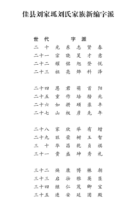 在本次修譜之前,佳縣劉家城劉氏的主字派以本次修譜的第一世祖劉翁起是:口(一世)、口(二世)、口(三世)、惠(四世)、風(fēng)(五世)、進(jìn)(六世)、世(t世)、天(八世)、國(九世)、延(十世)、成(十一世)、步(十二世)、宣(十三世)、永(十四世)、建(十五世)、長(十六世)、生(十七世)、忠(十八世)、元(十九世)。根據(jù)吾族人丁興旺、支脈眾多,輩分跨度較大的實(shí)際情況,按照過去只用一個(gè)字為派序統(tǒng)領(lǐng)一世起名的習(xí)慣已不適應(yīng)。在新編字派時(shí),避免與前輩的主字派重復(fù),經(jīng)慎重考慮,從字音、字義、字形、等方面聯(lián)系起來,避開生僻字,仔細(xì)挑選,有與劉字搭配條件的漢字而編排的。從“元”字輩(不含“元”字輩)往下排,即從第二十世起,新排十六輩,排到第三十五世,每輩排五個(gè)漢字,共選排八十個(gè)漢字。族人在起名時(shí),選用其相應(yīng)輩分中的五個(gè)漢字中的某一個(gè)漢字,再加上自選字組成本人之名。不至于以后起名再無譜可依,無字可傳,出現(xiàn)雜亂,輩分難分的現(xiàn)象。望全體族人參照字派,按門頭統(tǒng)一選擇用字,認(rèn)真起用。