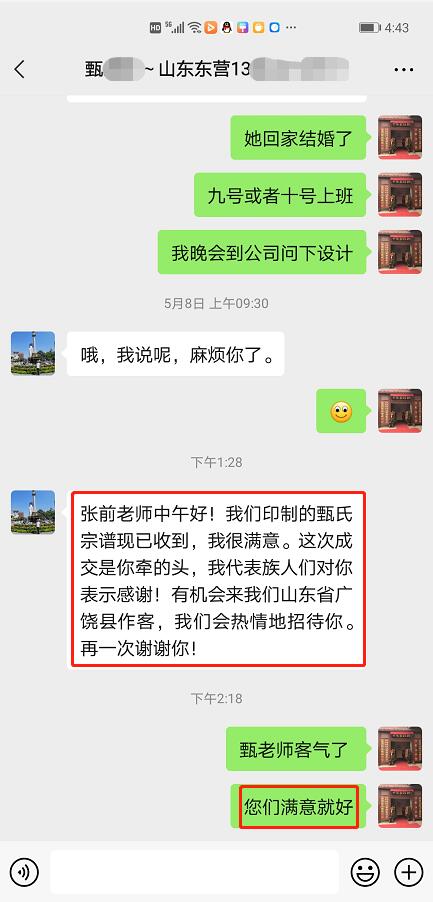 日前,由錦秋文譜負責(zé)的山東省東營市廣饒縣樂安街道甄廟村甄氏宗譜現(xiàn)已編修印刷完畢,并全部交貨給客戶。甄氏宗譜編修委員會甄老師說,錦秋文譜印制的甄氏宗譜現(xiàn)已收到,很滿意。這次成交是錦秋張編輯牽的頭,代表族人們對錦秋表示感謝!并誠摯邀請張編輯有機會來山東省廣饒縣作客,他們會熱情地招待,一盡地主之意。