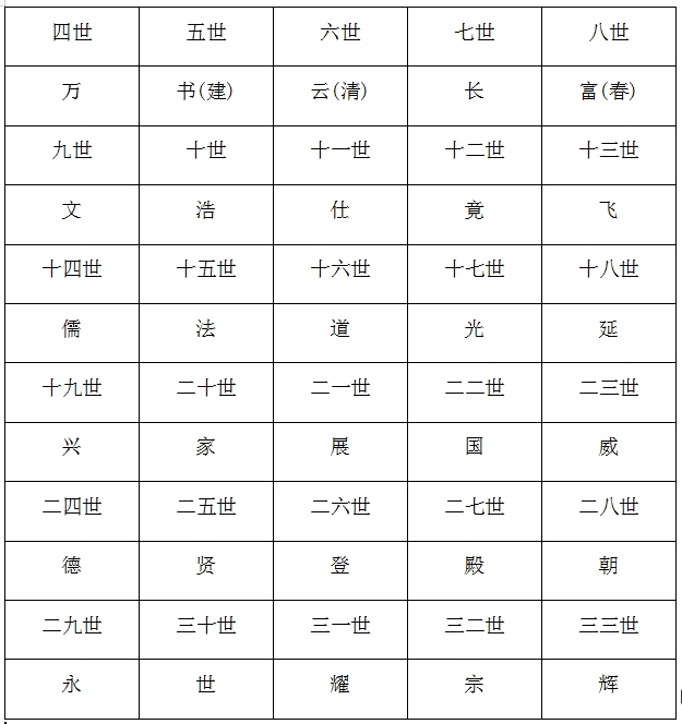 本次續(xù)字輩,“萬”字為我楊氏四世,“萬”字輩在祖墳中在四排葬著,因三排,二排,一排墳三代人,為了子孫后代,奮斗一生,均連名字都沒留下,這不得不說是一個極大憾事,吾族無不扼腕嘆惜,因此,這次續(xù)譜,實為斷代譜,這種教訓(xùn)吾族裔孫永記。為了本族各支系子孫下代,不走前輩的覆轍,為使后代人起名有循有章以達到立世系,序長幼,辨親疏,尊祖敬宗,凝聚血親的目的。特續(xù)新譜,永記史冊世珍藏,吾族子孫從有家譜新書起,一律按新續(xù)字輩起名,一代用一個字為字派,男孩女孩一樣,不得隨意更改,以避免亂起名造成同字不同輩現(xiàn)象,望一定遵守。