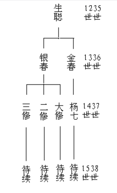 一. 九娘娘廟河一支楊姓是約二百年前經(jīng)三門第六支系三十三世祖諱學(xué)文之孫生聰(當(dāng)時(shí)已去世)之妻攜其兩個(gè)孩子金春、銀春由楊槐村遷此。當(dāng)年由于楊槐村地勢(shì)低洼,莊稼連年遭受水災(zāi)。有一年下大暴雨,村北賈魯河多處決口使莊稼絕收。無奈的老祖奶只好帶兩個(gè)孩子出外逃荒度日。那時(shí)候,住在鄭縣、密縣、新鄭縣三縣交匯處梅山的一個(gè)山洞里。被淹怕的老祖奶看到這里不怕水淹,山下又有清澈見底的九娘娘廟河泉水可食用,真可謂風(fēng)水寶地矣!于是,老祖奶就拿定主意在此定居安家。她一邊領(lǐng)兩個(gè)孩子要飯,一邊領(lǐng)兩個(gè)孩子在山坡上開荒種田。隨著歲月的流逝,老人思念親人,思念故鄉(xiāng)楊槐。一天,她就帶兩個(gè)孩子在開的兩塊荒地里各栽一棵古槐樹(亦稱國槐或本地槐)。老人家邊栽樹邊語重心長(zhǎng)的含淚交待孩子說:“兩棵槐樹就象征恁倆、象征楊槐,一定要精心培育,使它茁壯成長(zhǎng);恁倆以后還要交待子孫后代往下傳, 看見古槐樹就是看到老家楊槐村啦!要叫子子孫孫記住咱是楊槐人”。