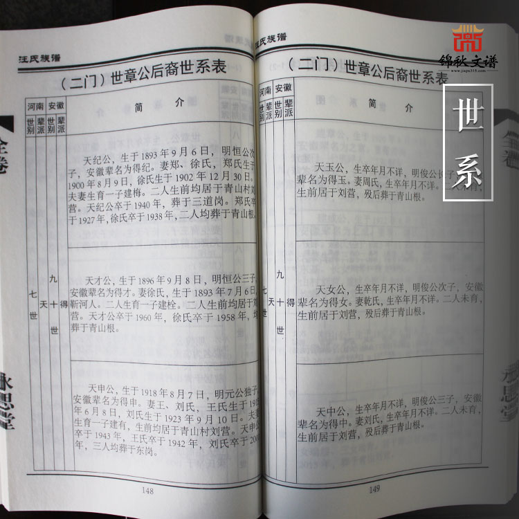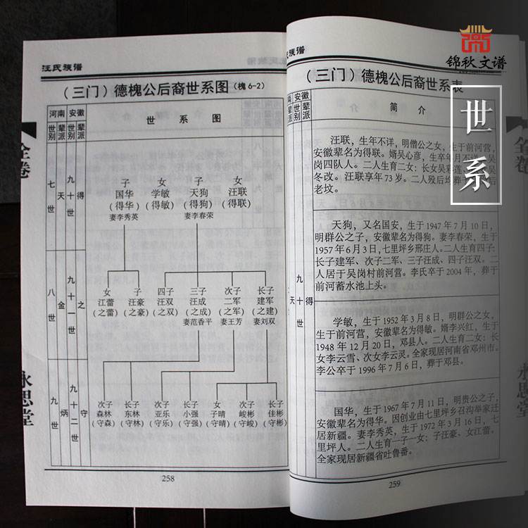 三、世系:世系是本譜的主要內(nèi)容。世系圖表是以圖表的形式反映家族成員的血緣關(guān)系,對(duì)一個(gè)人生、老、病、死、葬的簡(jiǎn)要介紹。入譜族人皆寫譜名,譜名未按輩起的,同時(shí)登錄身份證名。單字名前帶姓。所生多個(gè)子女,一般按先書子后書女的順序記載。為體現(xiàn)男女平等的時(shí)代特點(diǎn),男可入贅,女可承宗。女丁出嫁或招婿,其所生子女如隨母姓汪,均予收錄,其夫婿姓名,身份,亦可與娶入媳婦同等待遇,一樣上譜,對(duì)于出嫁女同樣署名,其夫婿住址及姓名均一一載明,以備后輩尋訪。但所生子女只登錄同一格,不再另格介紹。