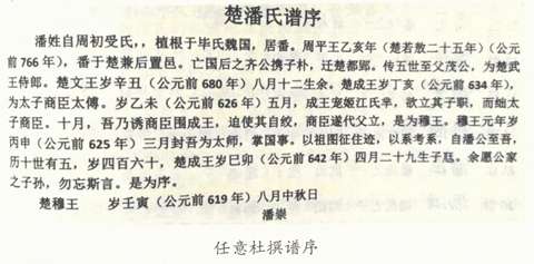 某潘氏支系族譜中還有東周時期,即公元前625年,楚國太師潘崇公,用白話文寫的假譜序。