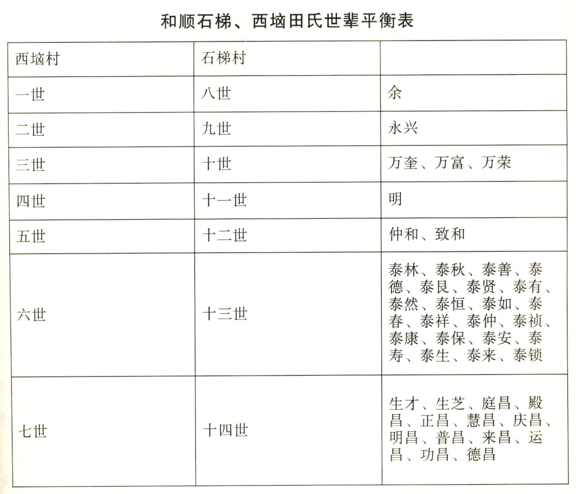 2016年6月27日上午,和順縣西垴村十七世孫田芳從太原回來開車和我一同到和順縣縣城找到石梯村十三世孫昌壽,一同到西垴村考證從石梯村八世祖遷出的族親,經(jīng)石梯十三世孫昌壽、西墻村十四世孫潤昌、十六世孫芝旺,十七世孫田芳、下蔭營田家溝十五世孫金太,共同進行了認真的平衡世系,從石梯家譜記載及兩位族親從上輩口傳考證,石梯田氏三門六世祖秀公,八世祖田余公遷西垴村,遷出年代失考,傳說西垴村遷河北邢臺將水一支,西垴一支田氏現(xiàn)遷安徽合肥,傳說石梯遷昔陽方向一支,支系年份失考[傳說石梯田氏分祖產(chǎn)(木材),昔陽一支同西垴田氏一同回石梯按份分祖產(chǎn))