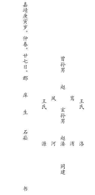趙城西南隅。洨水之東涯上。去城僅三里余地,名南鄭村。此間水明山秀。且草木暢茂。有趙氏之先塋。馬曰。趙氏者。其先晉人也。曾祖貴。于永樂間。救遷趙。遂家于此。貴娶馬氏。生三子。長曰發(fā)才。次曰德才。次曰全。俱以農(nóng)雜為業(yè)。爰致豐足。發(fā)才娶李氏。生一子。曰王。德才娶蘇氏。生二子。曰福臣。福厚。全娶亢氏。生一子。曰瓚。瓚娶王氏。生鸞與鳳。貴及鸞。蓋四世矣。至此而家道益隆。子孫蕃衍比之前世蓋愈有光。趙之人誰兒童走卒靡不知趙之有趙氏也。