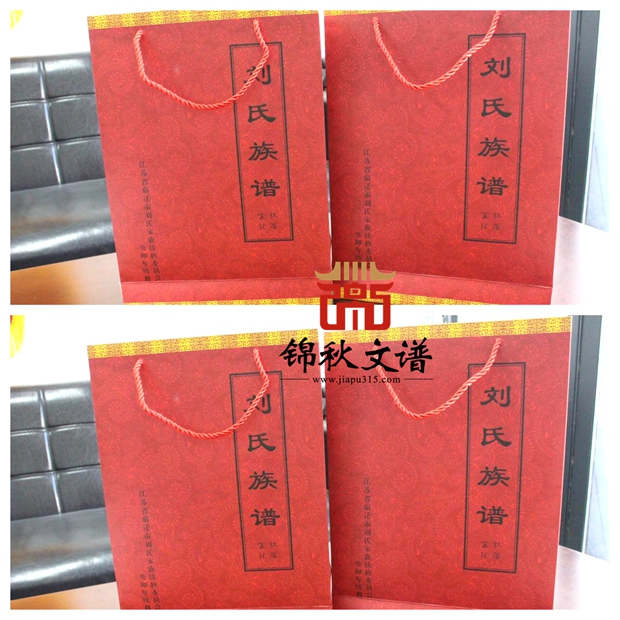 在劉氏家族的要求下,錦秋文譜為其家族設(shè)計了手提袋。整體以紅色為主,黃色為輔,字體采用黑色宋體的設(shè)計。正面寫著:“劉氏族譜,敦厚堂記,江蘇省宿遷市劉氏家族續(xù)修委員會,二〇二三癸卯年續(xù)修”的字樣。反面寫著:“我從哪里來家譜有記載,我到哪里去族譜有延續(xù)。宿遷市劉氏家譜續(xù)修紀(jì)念,壬寅仲夏本族堂第九氏孫明中立?!笔痔岽闹饕饔檬菫榱饲迕骷雷孢^程中,更好的為族人頒發(fā)族譜 ,以示重視。